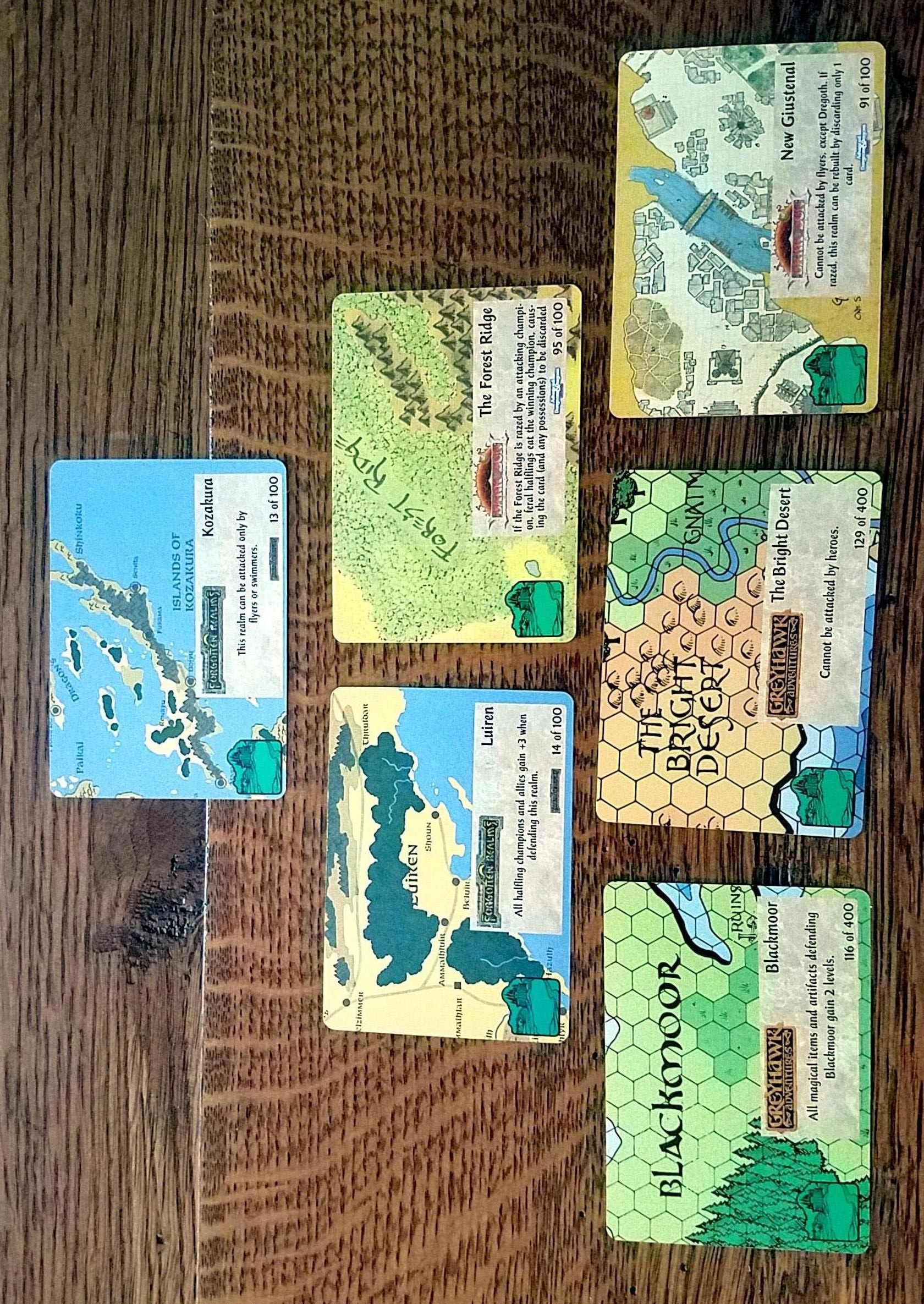 Placing the Realms was an important strategy in Spellfire as they had to be attacked in a particular order. The foremost Realm protected the two Realms behind it; Those two Realms protected the three behind them. Placing a really tough Realm in that first position could be a nightmare for your opponent. Either they had to raze it or have Champions with special abilities like Flying or Earthwalking to essentially bypass the problem Realm.