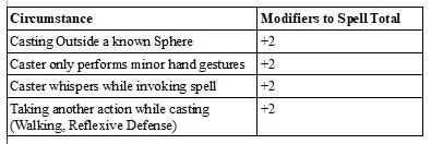 Spells have a set amount of successes needed to cast the spell, represented by the Spell Total. This number can, however, go up depending on the circumstances. The following table lists modifiers that may be applied to the Spell Total: